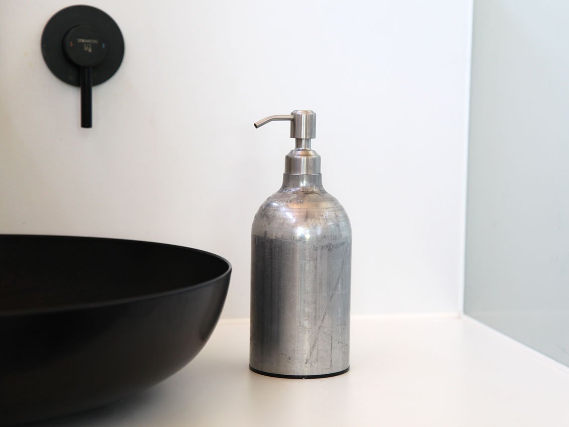 The innovative FIRE dish soap dispenser, made from recycled gas cylinders, brings style and functionality to any kitchen with its trendy design. The decorative dispenser is available in 9 beautiful colors and can be filled with your choice of liquid. Simply pumping the bottle dispenses the desired amount of dish soap. The dispenser also looks great in the bathroom, as liquid soap and shower gel can be easily dispensed with this clever dispenser. This high-quality dispenser for dish soap, hand soap, shower gel, and lotion is handcrafted in Bavaria from recycled gas cylinders. It keeps the desired liquid readily available in the kitchen, bathroom, and guest toilet.